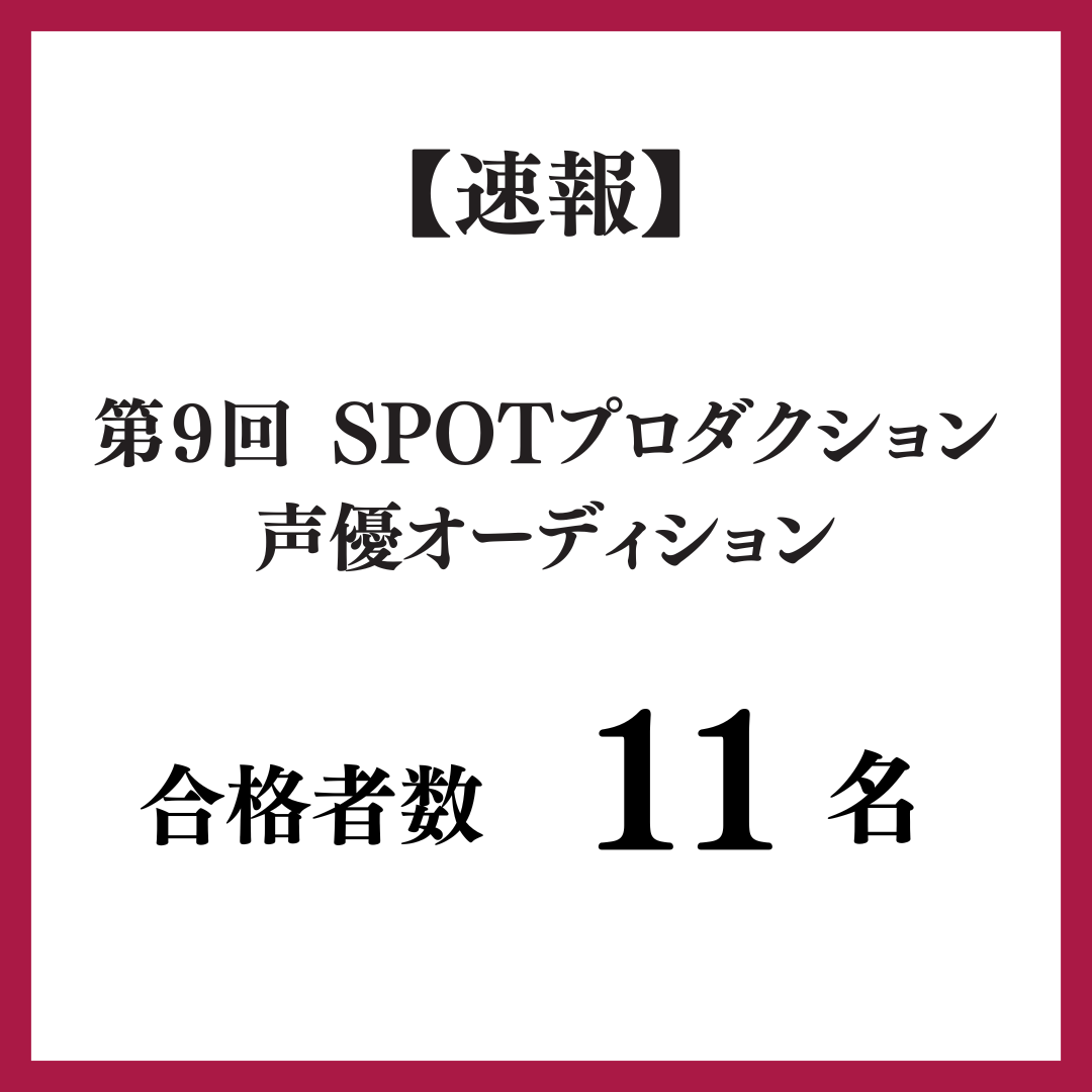 過去のオーディション情報 【速報】第9回 SPOTプロダクション声優オーディション 合格者数は11名 第9回 SPOTプロダクション声優オーディションの結果をメールにて送付させていただきました。 第9回 SPOTプロダクション声優オーディション開催! 第9回SPOTプロダクション声優オーディション 一次審査通過者は35名 一次審査通過者発表! 一次審査 合格者発表は1月23日(金) 第9回 SPOT プロダクション声優オーディション情報 AnimeJapan2025特設オーディション 結果発表! 第8回 SPOT プロダクション声優オーディション情報 第7回 SPOTプロダクション声優オーディション情報 三好りえプロデュースイベント オーディション合格者決定! SPOT講師 三好りえプロデュースイベント 受講者対象出演オーディション 第6回 SPOT 2023年夏季 プロダクション 声優オーディション情報 第5回 SPOT 2023年冬季声優オーディション情報 「音読ステージ STORYOFSONGS Track1 ORNGERENGE」 影アナオーディション開催 第4回SPOT 2022年夏季声優オーディション情報 第3回SPOT 2022年冬季声優オーディション情報 第2回(2021年度)SPOT声優オーディション情報 第1回(2020年度)SPOT声優オーディション情報